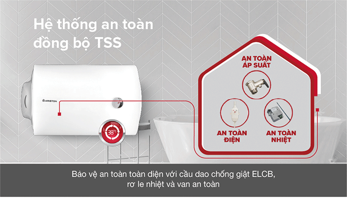 - Hệ thống chống giật, chống bỏng TSS giúp cho người dùng tránh được việc bị bỏng do nước nóng quá mức, đồng thời tự động ngắt nguồn điện khi nước nóng vượt mức đầu ra cho phép.