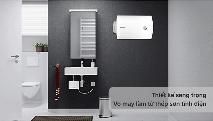 - Bình nóng lạnh Ariston được thiết kế hình chữ nhật, lớp vỏ được làm bằng thép phun sơn tĩnh điện nên có khả năng giảm thiểu trầy xước trong quá trình sử dụng cũng như đảm bảo độ bền màu cho sản phẩm.