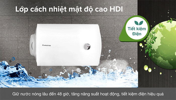 Lớp cách nhiệt HDI giữ nóng lâu đến 48 giờ, hạn chế thất thoát nhiệt trong quá trình sử dụng, giúp tiết kiệm điện năng khi làm nóng nước.