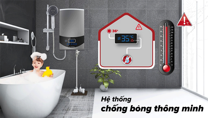 Bình nóng lạnh trực tiếp tự động ngắt quá trình làm nóng nước khi phát hiện ra nhiệt độ nước ở đầu ra vượt quá mức quy định, tránh làm bỏng cho người sử dụng do nước quá nóng.