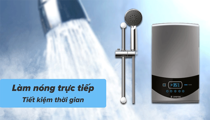 Bình nóng lạnh trực tiếp Ariston có kích thước nhỏ gọn, đi cùng cơ chế làm nóng nước bằng thanh điện trở, sau đó nước nóng được đưa trực tiếp ra vòi để bạn có thể sử dụng gần như ngay lập tức sau khi bật máy mà không cần đến bình trữ nước.