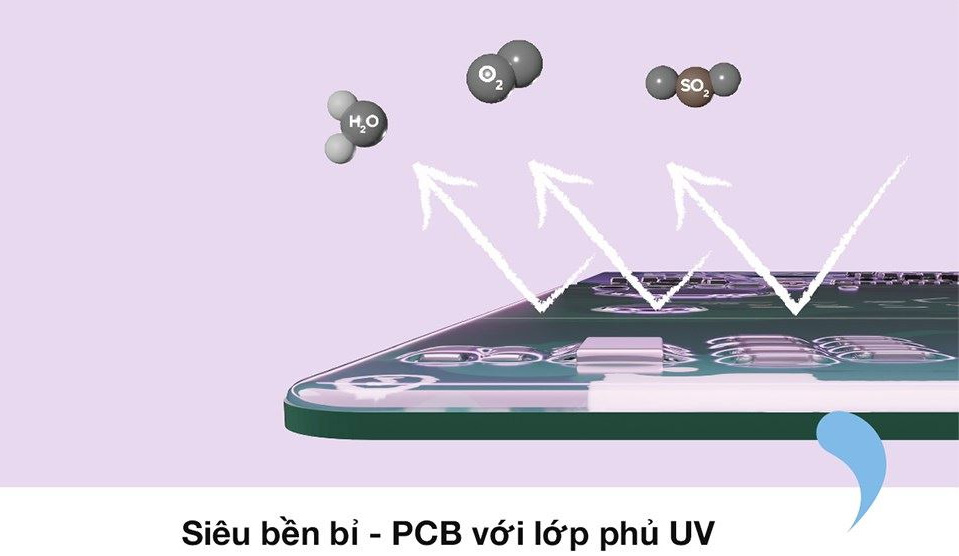 PCB phủ UV: Bo mạch được phủ lớp UV giúp chống ẩm, bụi bẩn và côn trùng, từ đó tăng độ bền và giúp máy hoạt động ổn định hơn theo thời gian.