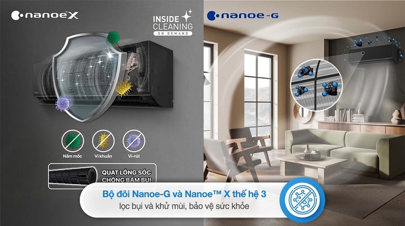 Panasonic trang bị đồng thời Nanoe™ X thế hệ 3 và Nanoe-G giúp xử lý bụi mịn, vi khuẩn và mùi khó chịu trong không khí. Nhờ đó, không gian luôn sạch thoáng, phù hợp cho gia đình có trẻ nhỏ hoặc người nhạy cảm.