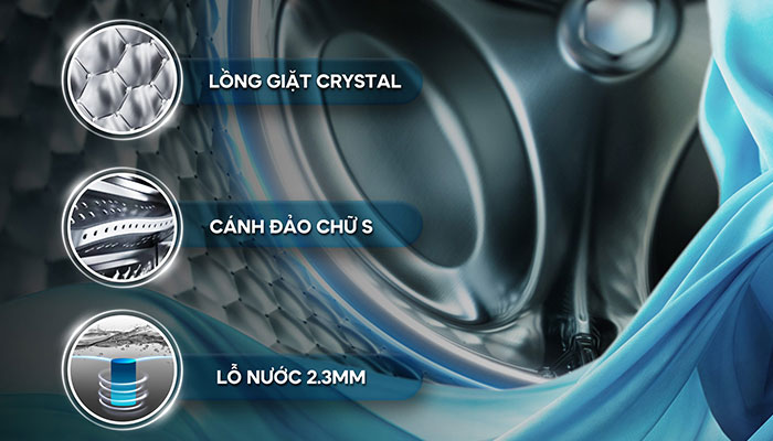 Máy giặt sấy lồng ngang Casper inverter 11.5kg sấy 8kg WF-P115VGT11 bề mặt lồng giặt Crystal thiết kế gờ nổi dạng tinh thể pha lê kết hợp cùng cánh đảo chữ S và hàng ngàn lỗ phun đường kính siêu nhỏ 2.3mm giúp tăng cường hiệu quả giặt giũ quần áo mà vẫn nhẹ nhàng với bề mặt sợi vải như giặt tay, giữ quần áo như mới sau nhiều lần giặt. Tia nước áp lực cao từ các lỗ phun siêu nhỏ khi kết hợp cùng tốc độ vòng quay cao sẽ xuyên thấu để loại bỏ mọi vết bẩn bám trên từng sợi vải.