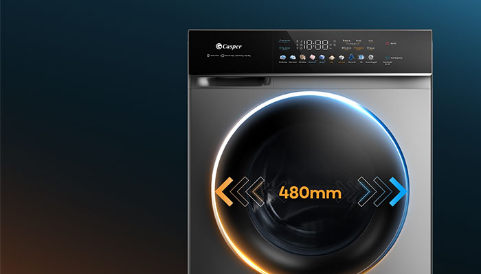 Máy giặt sấy Casper lồng ngang WF-P115VGT11 thiết kế cửa lồng giặt lên tới 480mm phù hợp với nhu cầu giặt đồ khối lượng lớn, giúp mọi thành viên trong gia đình thao tác thuận tiện, dễ dàng, cho dù là quần áo dày nặng hay chăn ga gối cồng kềnh.
