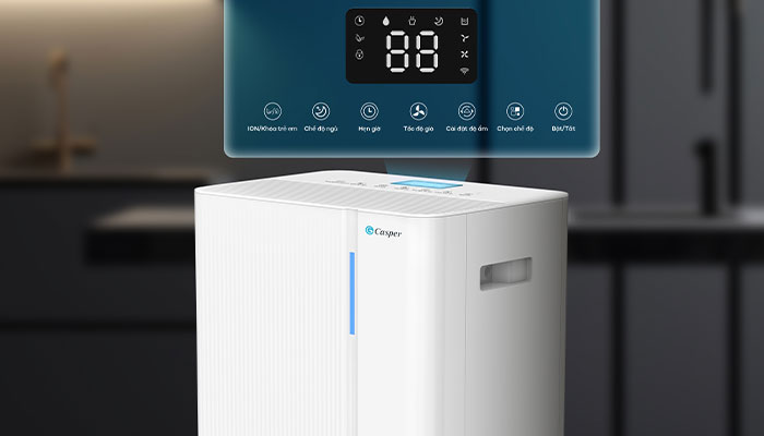 Máy hút ẩm Casper DE-30L1 có màn hình hiển thị độ ẩm rõ nét đặt ở mặt trên, giúp người dùng dễ dàng quan sát và tuỳ chỉnh mức độ ẩm theo nhu cầu sử dụng.