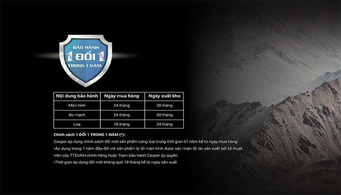 Áp dụng trong 1 năm đầu đối với sản phẩm bị lỗi màn hình được xác nhận lỗi do nhà sản xuất bởi kỹ thuật viên của TTDVKH chính hãng hoặc Trạm bảo hành Casper ủy quyền.