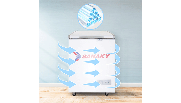 Tủ đông Sanaky có dàn lạnh bằng nhôm có hiệu quả truyền nhiệt tốt, đẩy nhanh tốc độ làm lạnh. Ngoài ra đây dàn lạnh bằng nhôm còn tiết kiệm chi phí cho người sử dụng khi có giá thành phải chăng.