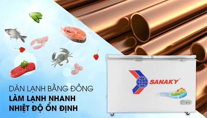 Tủ đông Sanaky giá rẻ không chỉ nâng cao tuổi thọ và độ bền bỉ của tủ đông, dàn lạnh được làm từ đồng nguyên chất còn có khả năng dẫn nhiệt rất tốt. Nhờ vậy các loại thực phẩm sẽ được bảo quản lạnh sâu hơn, trong điều kiện lý tưởng hơn, cho thực phẩm giữ được hương vị và dưỡng chất.
